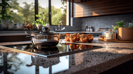 Modern kitchen interior design with granite countertop Digital composite on induction hob in modern kitchen