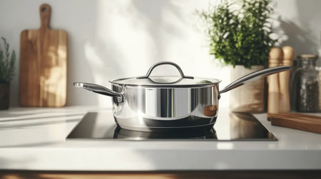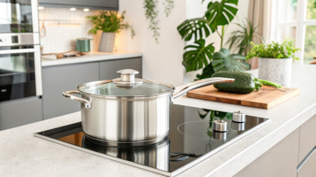 Stainless steel pan on an induction stove in a modern kitchen with wooden finishes, perfect for efficient home cooking