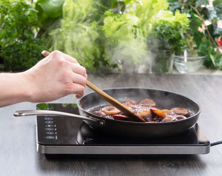 Modern kitchen appliance, Induction stove with steel frying pan