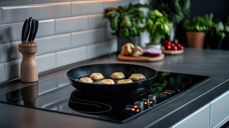 Frying pan in modern kitchen with induction stove. High quality photo