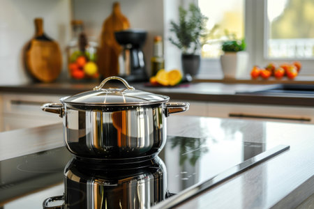 A metal pot on an electric induction cooker in a modern kitchen. Copy space.