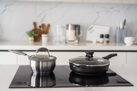 Cookware on induction hob in modern kitchen interior