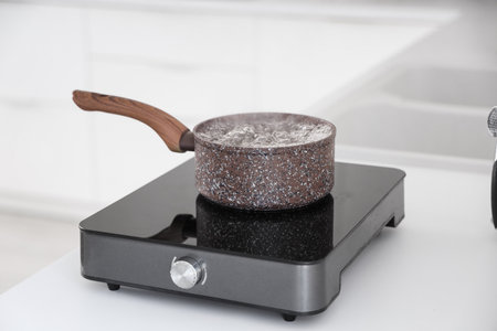 Saucepan with boiling water on mini stove in kitchen