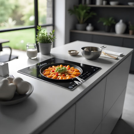 A contemporary kitchen island featuring an induction cooktop, stylish cookware, and fresh ingredients ready for culinary creations and dining.