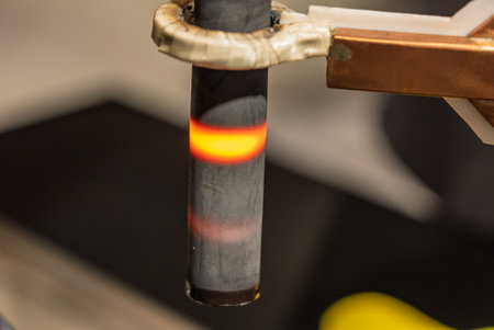 Medium shot of tubular metal being heated through induction hardening system showing electric coil wrapped tightly around the tube for deep hardening