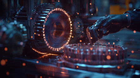 This image showcases a close-up view of machinery components with a glowing effect in an industrial environment, emphasizing precision engineering and technology.