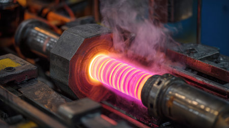 A captivating industrial scene showcasing fiery machinery amidst billowing smoke, highlighting the intense atmosphere of manufacturing and engineering processes.