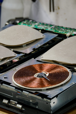 Close-up of a coil of copper wire standing on a large microcircuit against the backdrop of modern electronic equipment. Powerful oscillatory circuit and high-frequency components