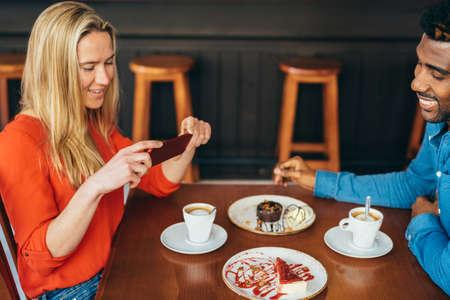 Caucasian woman taking a picture with her cellphone of a cheesecake while drinking coffee with her boyfriend