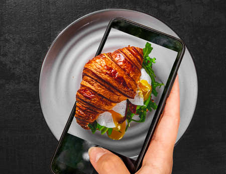 woman hand holding and showing smart phone takes a photo Croissant sandwich with poached egg, tomato and avocado on plate on Dark grey black slate background. food photos