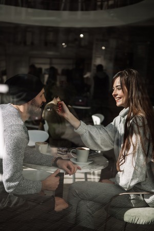 The young beautiful girl drinking coffee and eating dessert. Photographing your food