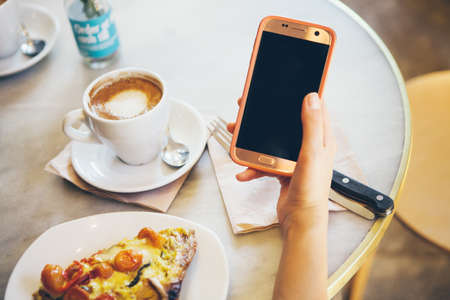 Close-up of woman's hands holding cell phone while drinking coffee and eating vegetable quiche in modern cafe. Reading news, social network, surfing the web / internet in smartphone. Coffee break business.