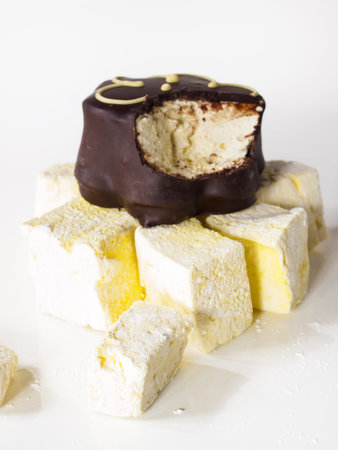 Gourmet chocolate covered passion fruit marshmallows on white background.