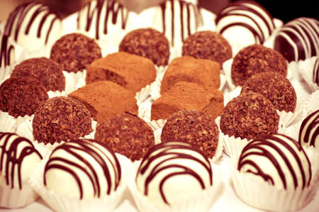 Small chocolate and vanilla layered cakes in rows on candy buffet. Sweet paradise.