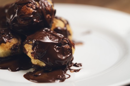 profiteroles covered with black chocolate on plate closeup, shallow focus