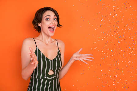 Photo of young girl happy positive smile amazed shocked surprise air fly confetti party isolated over orange color background