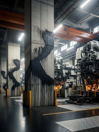 The interior of a large industrial factory features massive concrete pillars streaked with black paint, alongside intricate and complex manufacturing machinery.
