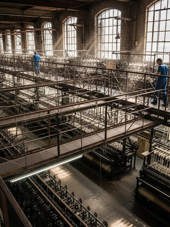 Sunlight streams through large windows into a vintage industrial textile mill, illuminating rows of looms and two workers amidst the machinery.