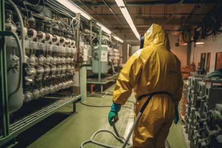 A person in a yellow coverall spraying water from a hose. Generative AI