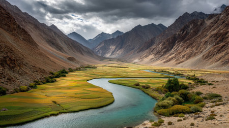 A breathtaking river winds through vibrant fields, framed by towering mountains and a dramatic sky, offering an ideal scene for nature lovers and photographers alike.