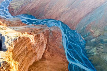 aerial view of canyon and riverbed, xinjiang anjihai, China