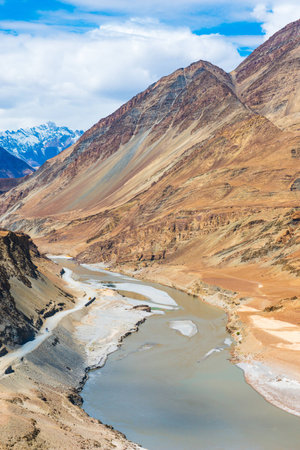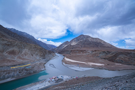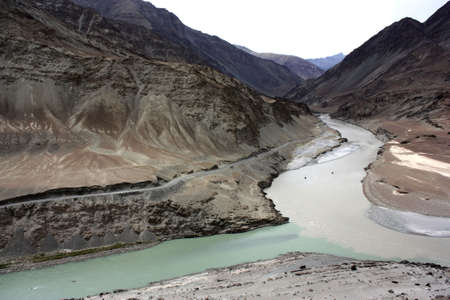 View of confluence of the Indus and Zanskar rivers located in Leh, Ladakh, Jammu and Kashmir, India.