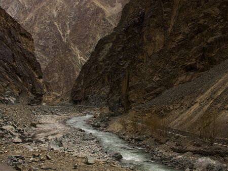 One of the tributaries of the Hunza river flowing through the beautiful mountain valley in the northern part of the Karakorum mountains in Pakistan