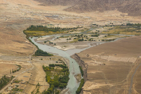 Aerial view of the Shyok river and high mountain from the airplane window. New Delhi-Leh flight ,India.