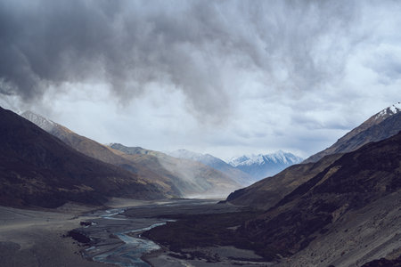 Curving river cutting through a vast barren Himalayan valley in Ladakh under heavy storm clouds, surrounded by rugged mountains and distant snowy peaks, evoking raw beauty, solitude, and untouched wilderness
