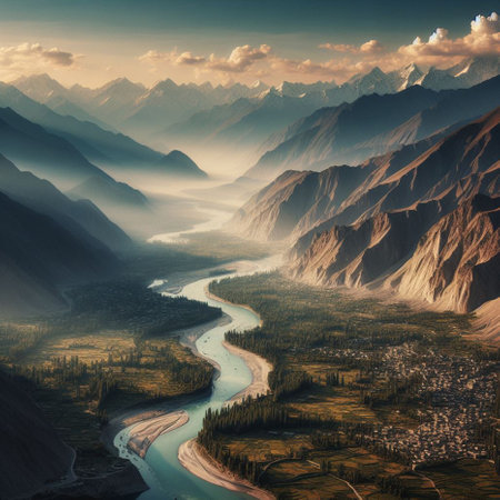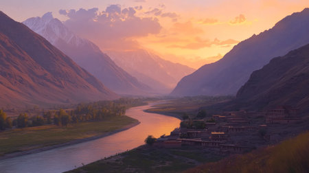 A breathtaking scene of a river winding through majestic mountains at sunset. The warm colors illuminate the landscape, creating a peaceful atmosphere ideal for nature lovers and travelers.