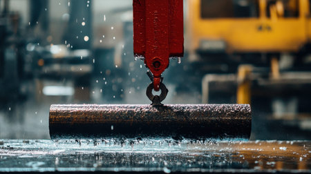 A heavy metal cylinder is being lifted by a crane hook in a factory environment. Water droplets splash around, creating a dynamic industrial scene.