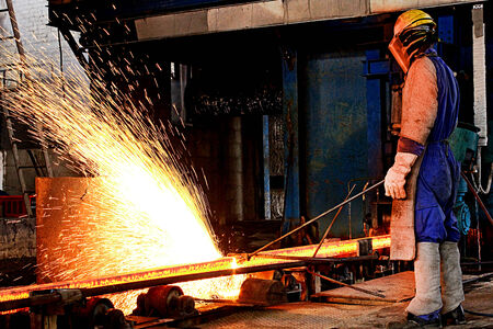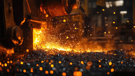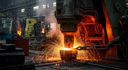 This dynamic image captures the intensity of steel production in an industrial forge, highlighting fiery molten metal and heavy machinery in action.