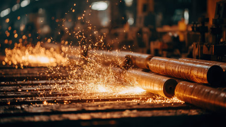 A dynamic close-up image capturing the sparks flying from a metal surface during a cutting process in a dimly lit workshop, showcasing the intense energy and craftsmanship involved.