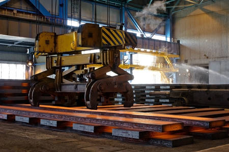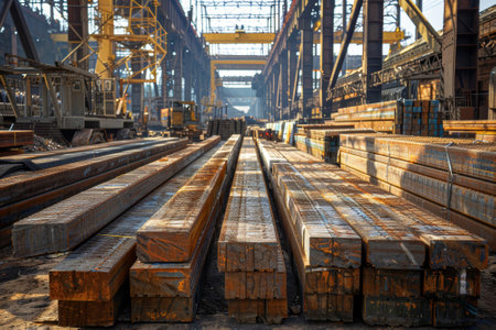 Staging area with steel slabs prepared for processing, featuring organized layouts, safety nets, and advanced inventory management devices.. AI generated.