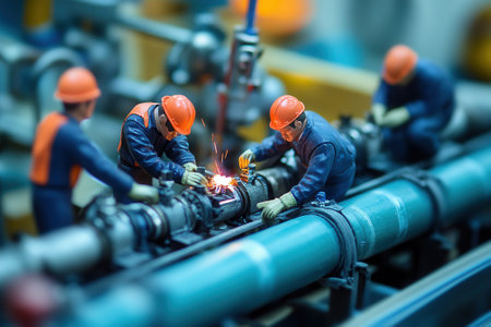 Miniature workers maintaining industrial pipeline, concept of oil and gas industry