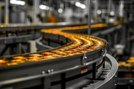 A conveyor system is actively transporting products in an industrial environment. The facility features bright lighting and organized machinery, enhancing workflow and efficiency.