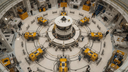 Overhead view of a high-tech industrial facility featuring circular machinery surrounded by yellow equipment. Workers are visible in the modern laboratory environment.
