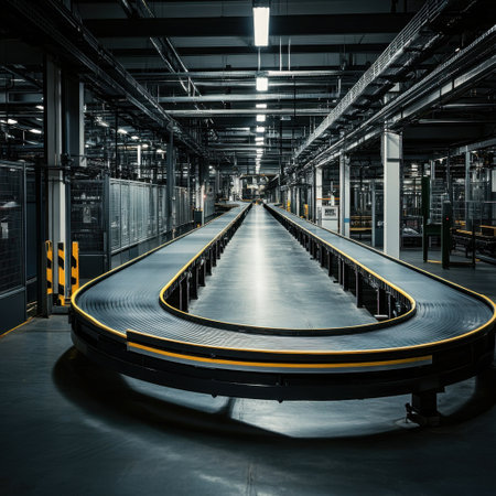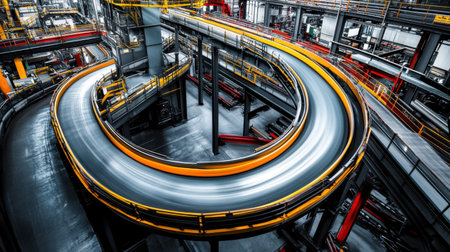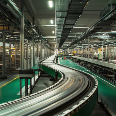 A captivating view of a modern industrial warehouse showcasing machinery and a conveyor belt, emphasizing technology and efficiency in production.