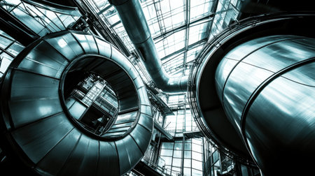 This striking image captures the intricate details of a modern steel structure, emphasizing spiral and curved forms within an urban environment, showcasing innovative design.