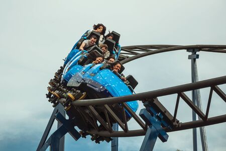 Canela, Brazil - July 21, 2019. People in a blue cart having fun on roller coaster in a cloudy day at the Alpen amusement park near Canela. A charming small town very popular by its ecotourism.
