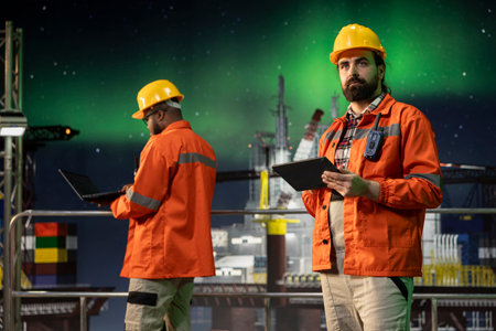 Environmental officer on offshore platform tracking emissions using tablet monitoring app. Worker ensuring sustainable drilling practices and spill prevention during 24 hour nonstop operation