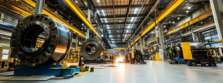 Large manufacturing facility with machinery and equipment during daytime operations in a modern industrial space