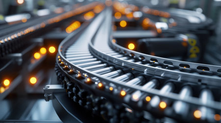 A captivating view of an industrial conveyor belt system in a modern warehouse. This image showcases advanced technology and infrastructure in a dimly lit environment, emphasizing efficiency and automation in the logistics process.