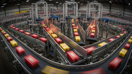 This image features an aerial view of a modern automated conveyor system in a high-tech warehouse, showcasing dynamic movement with bright yellow and grey elements.