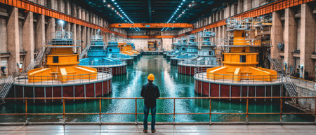 An engineer wearing a safety helmet inspects an industrial robot in a modern facility. This setting showcases advanced machinery and a large water environment, emphasizing safety and innovative technology in engineering.