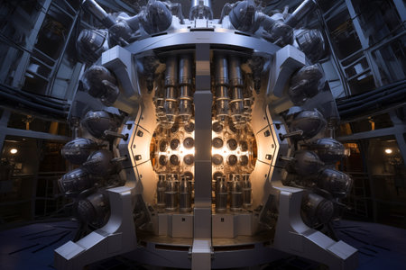 Nuclear reactor bathed in diffused natural light from above, highlighting its components. Generative AI
