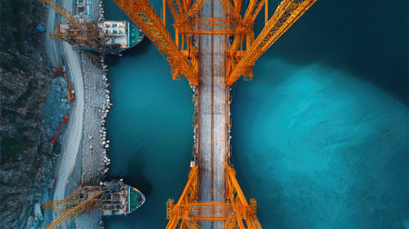 This captivating aerial shot captures a vibrant orange construction crane overlooking calm blue water, complemented by industrial vessels and intricate shoreline patterns.