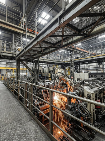 The interior of a large industrial plant with extensive piping, heavy machinery, and glowing sparks emanating from a production area, creating a dramatic atmosphere.