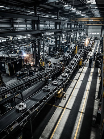 A long, organized assembly line stretches through a modern factory, showing automated machinery, conveyor belts, and workers engaged in production.