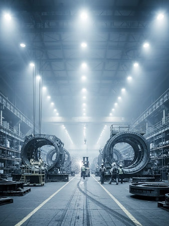 A vast industrial warehouse filled with enormous metal rings, shelves of equipment, and workers, illuminated by overhead lights and a forklift moving through the space.
